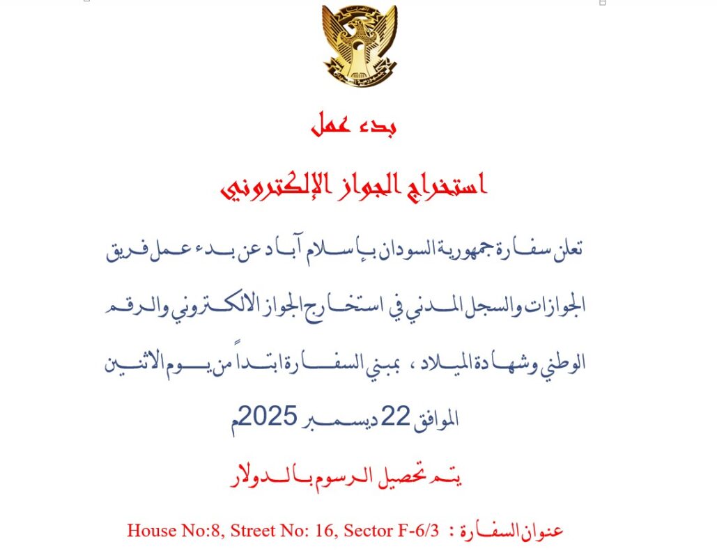 تعلن سفارة جمهورية السودان بإسلام  آباد عن بدء عمل فريق الجوازات والسجل المدني في  استخارج الجواز الالكتروني والرقم الوطني وشهادة الميلاد،  بمبني السفـــــارة  ابتداً من يــــــــوم الاثنين الموافق 22 ديسمبر 2025م