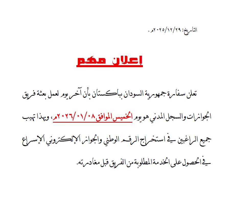 تعلن سفارة جمهورية السودان بباكستان بأن آخر يوم لعمل بعثة فريق الجوازات والسجل المدني هو يوم الخميس الموافق 08/01/2026م، وبهذا تهيب جميع الراغبين في استخراج الرقم الوطني والجواز الإلكتروني الإسراع في الحصول على الخدمة المطلوبة من الفريق قبل مغادرته.
